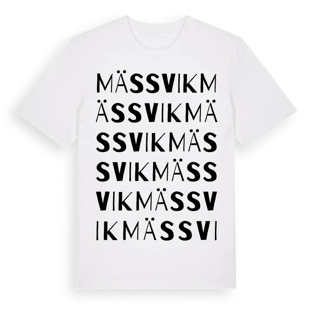 En ordlek byggd på Mässviks namn. Subtilt och klurig – ett motiv som bara de som verkligen känner platsen fullt ut förstår. Premium bomull, unisex – från Mässvik i Värmlands län.