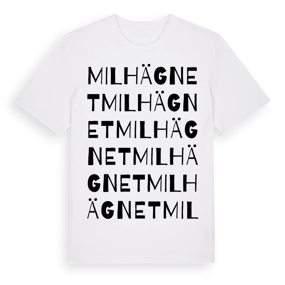 Milhägnet ordlek t-shirt är inspirerad av Milhägnet i Värmlands län, Sverige. Tröjan är designad för dig som har en speciell koppling till platsen – oavsett om du bor här, har rötterna här eller bara älskar Milhägnet.