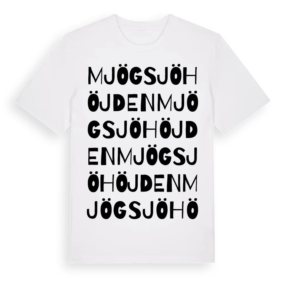 Mjögsjöhöjden ordlek t-shirt är inspirerad av byn Mjögsjöhöjden i Värmlands län, Sverige. Tröjan är designad för dig som har en speciell koppling till platsen – oavsett om du bor här, har rötterna här eller bara älskar Mjögsjöhöjden.