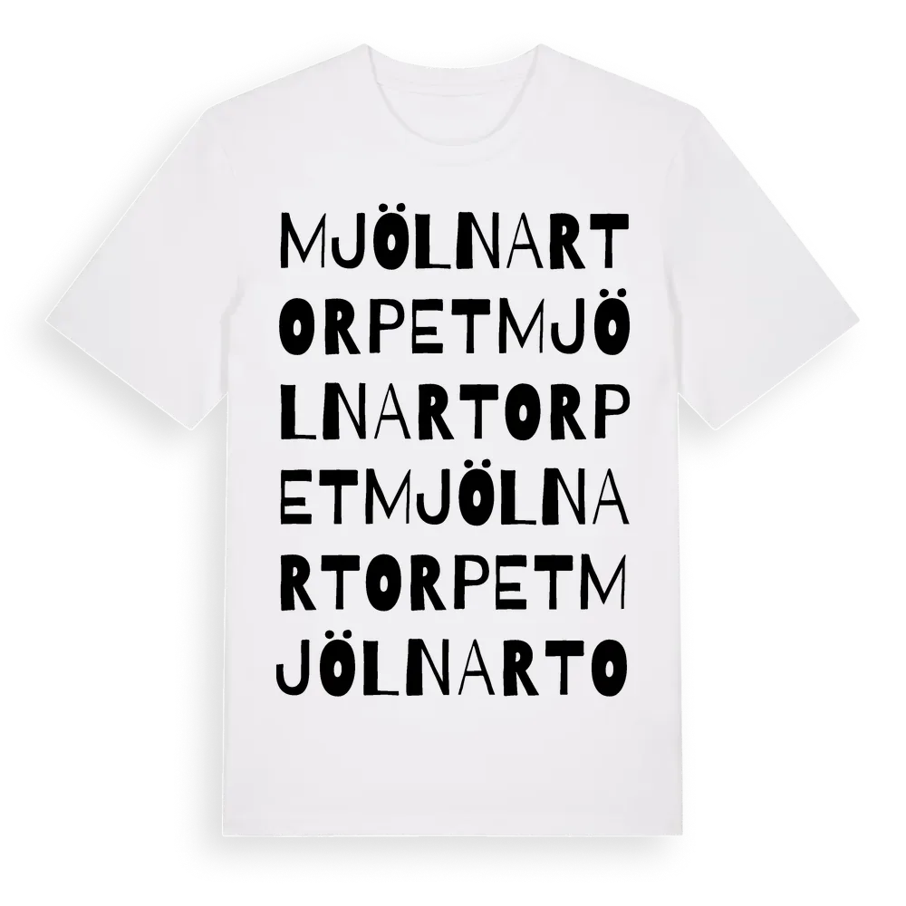 Mjölnartorpet ordlek t-shirt är inspirerad av stadsdelen Mjölnartorpet i Värmlands län, Sverige. Tröjan är designad för dig som har en speciell koppling till platsen – oavsett om du bor här, har rötterna här eller bara älskar Mjölnartorpet.