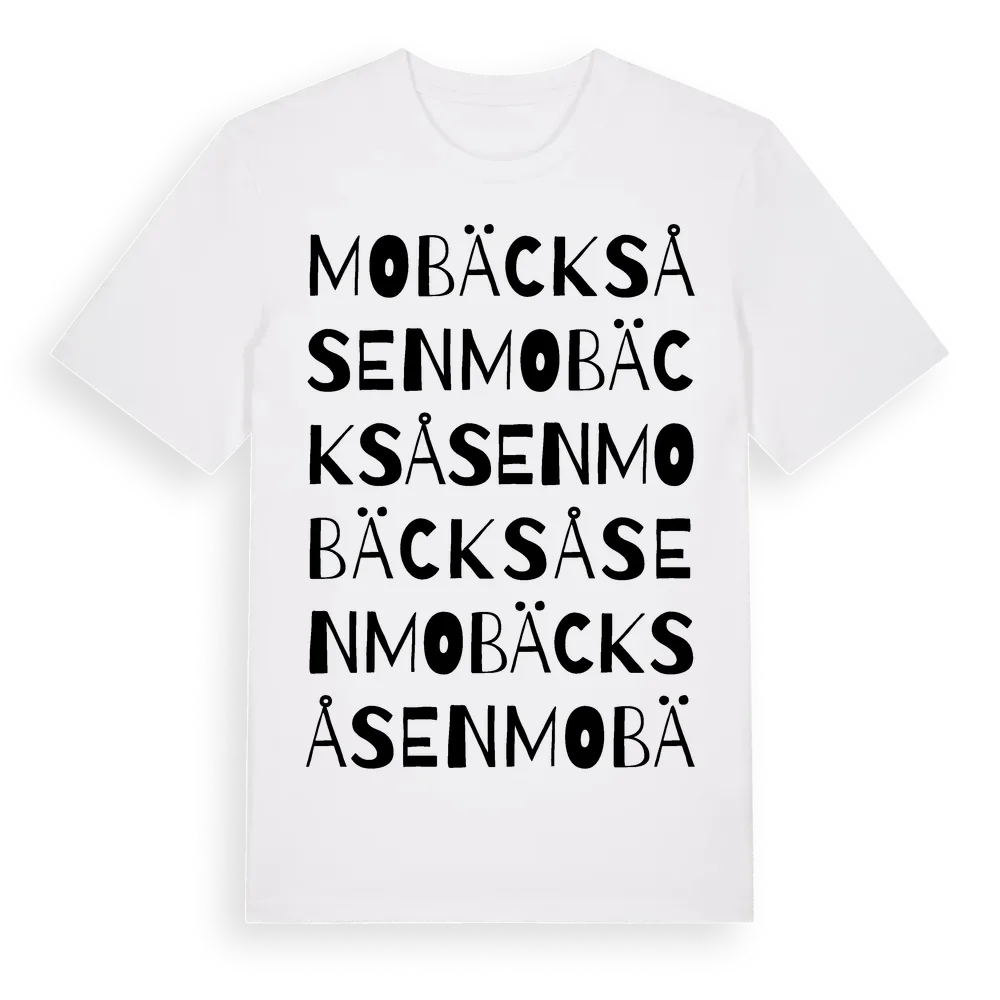 Mobäcksåsen ordlek t-shirt är inspirerad av Mobäcksåsen i Värmlands län, Sverige. Tröjan är designad för dig som har en speciell koppling till platsen – oavsett om du bor här, har rötterna här eller bara älskar Mobäcksåsen.