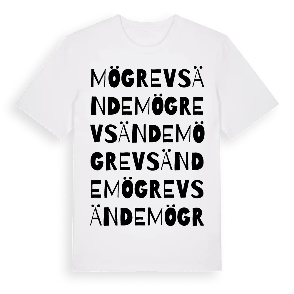 Mögrevsände ordlek t-shirt är inspirerad av Mögrevsände i Värmlands län, Sverige. Tröjan är designad för dig som har en speciell koppling till platsen – oavsett om du bor här, har rötterna här eller bara älskar Mögrevsände.