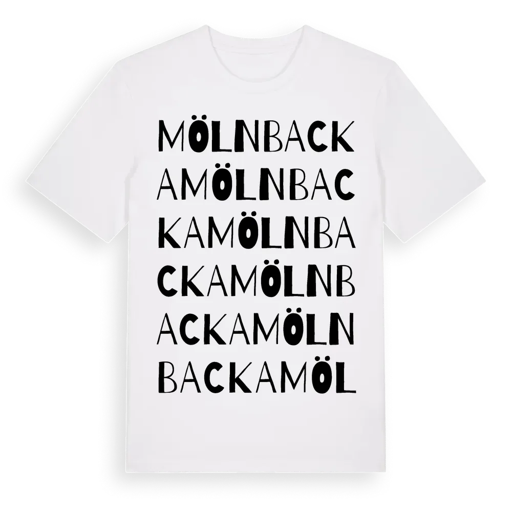 Mölnbacka ordlek t-shirt är inspirerad av Mölnbacka i Värmlands län, Sverige. Tröjan är designad för dig som har en speciell koppling till platsen – oavsett om du bor här, har rötterna här eller bara älskar Mölnbacka.