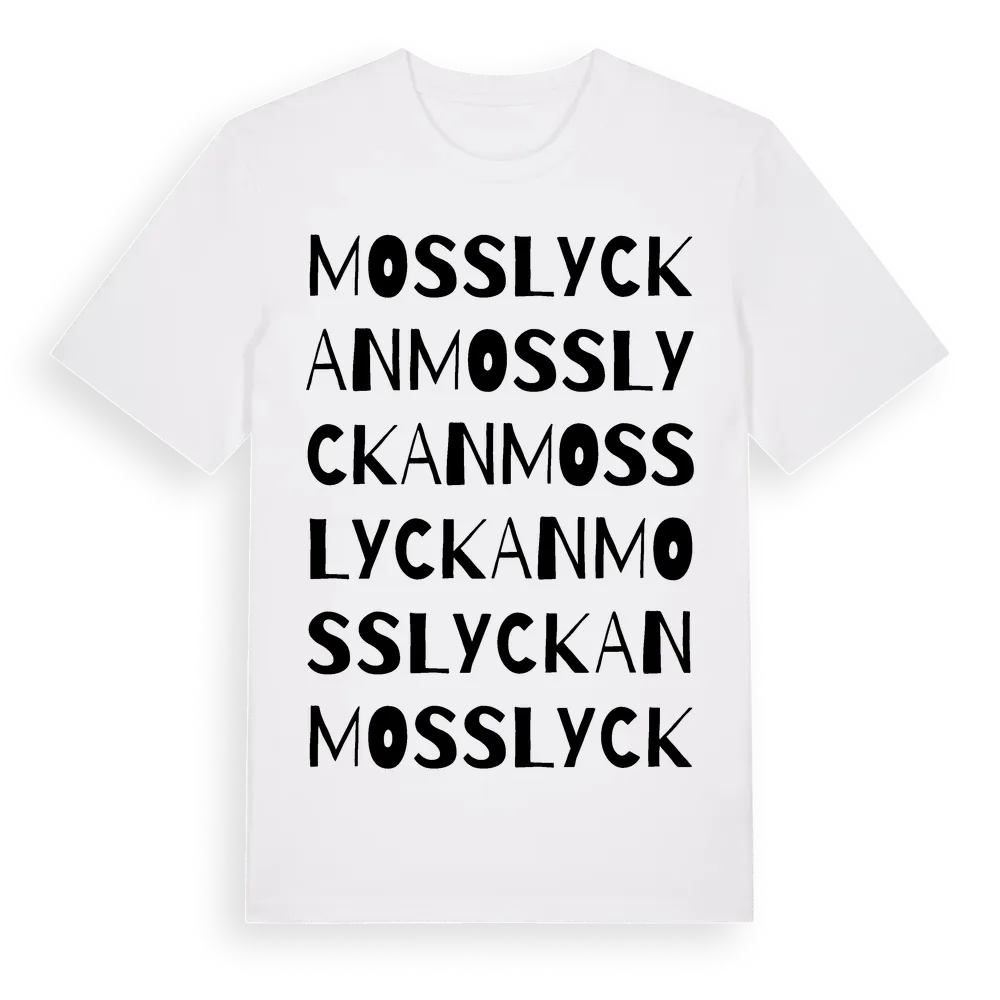 Mosslyckan ordlek t-shirt är inspirerad av Mosslyckan i Värmlands län, Sverige. Tröjan är designad för dig som har en speciell koppling till platsen – oavsett om du bor här, har rötterna här eller bara älskar Mosslyckan.