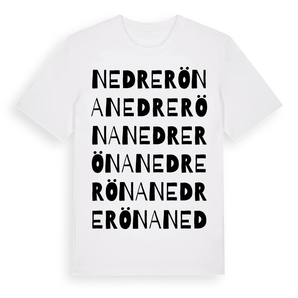 Nedre Röna ordlek t-shirt är inspirerad av Nedre Röna i Värmlands län, Sverige. Tröjan är designad för dig som har en speciell koppling till platsen – oavsett om du bor här, har rötterna här eller bara älskar Nedre Röna.