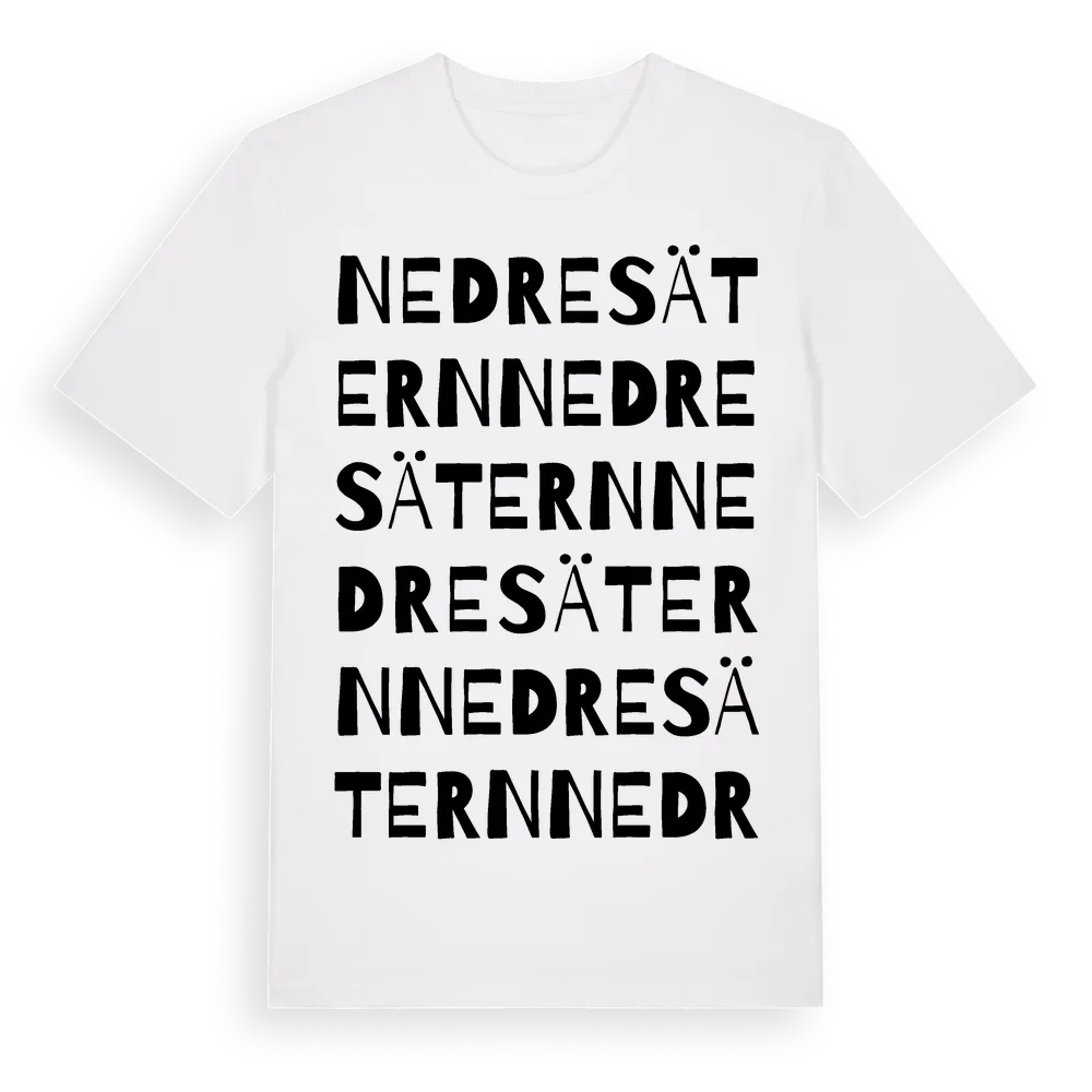 Nedre Sätern ordlek t-shirt är inspirerad av Nedre Sätern i Värmlands län, Sverige. Tröjan är designad för dig som har en speciell koppling till platsen – oavsett om du bor här, har rötterna här eller bara älskar Nedre Sätern.
