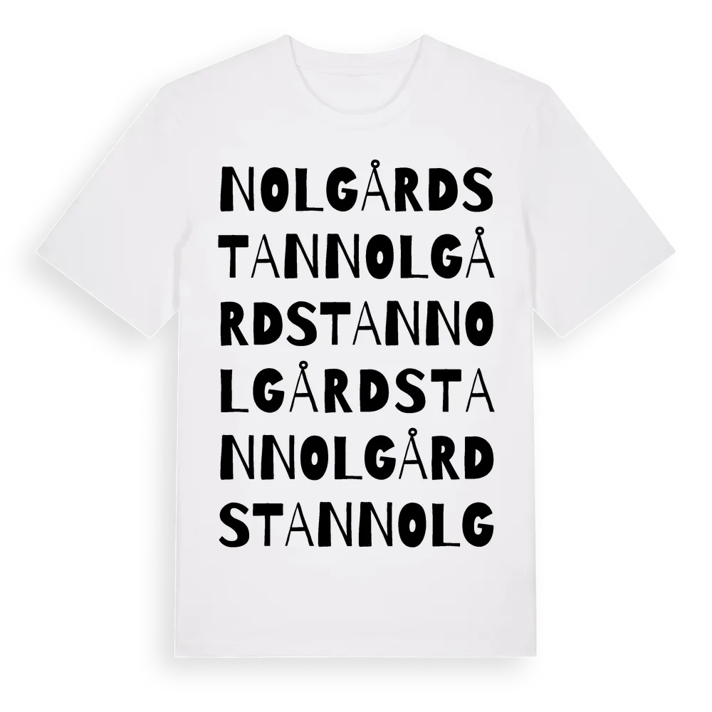 Nolgårdstan ordlek t-shirt är inspirerad av Nolgårdstan i Värmlands län, Sverige. Tröjan är designad för dig som har en speciell koppling till platsen – oavsett om du bor här, har rötterna här eller bara älskar Nolgårdstan.