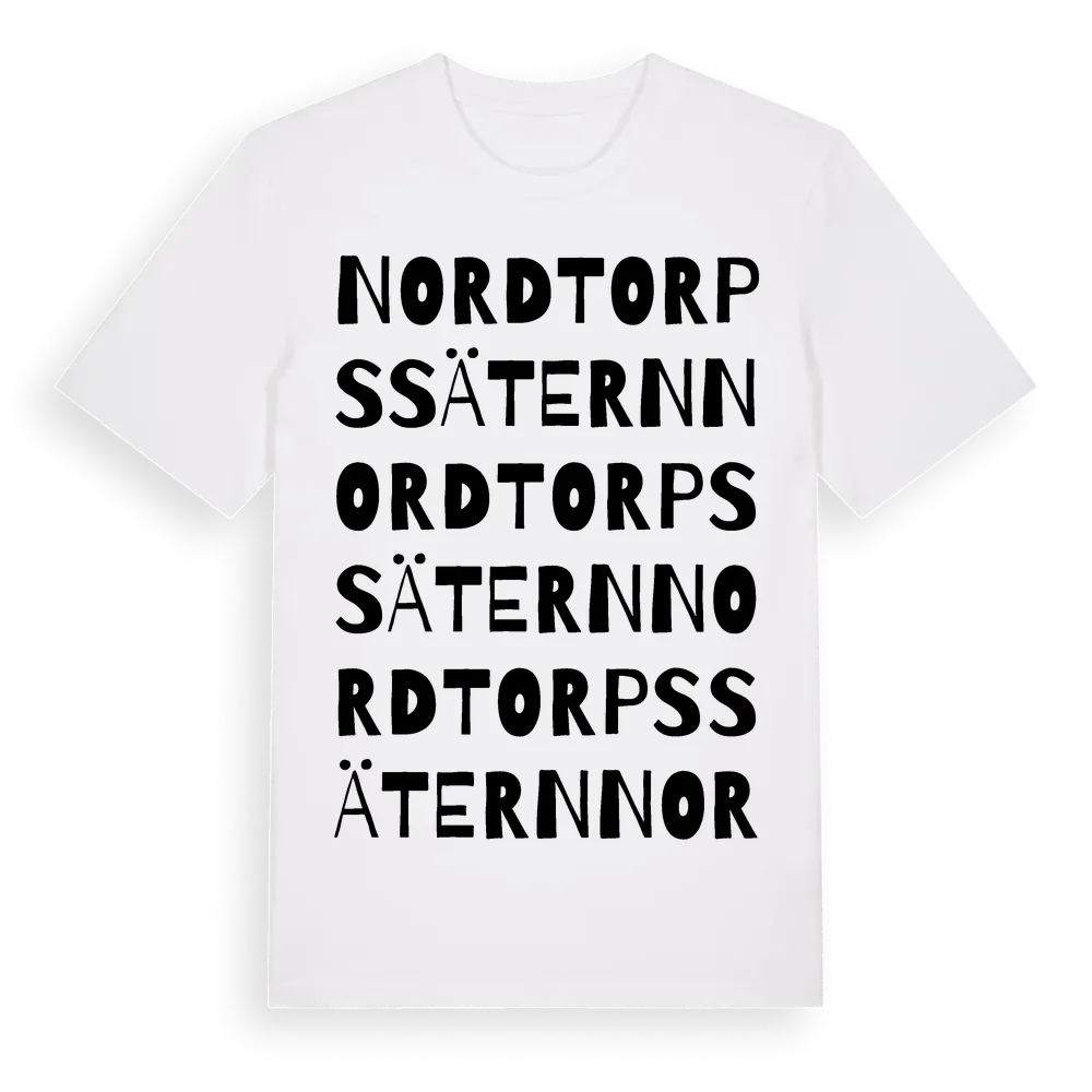 Nordtorpssätern ordlek t-shirt är inspirerad av Nordtorpssätern i Värmlands län, Sverige. Tröjan är designad för dig som har en speciell koppling till platsen – oavsett om du bor här, har rötterna här eller bara älskar Nordtorpssätern.