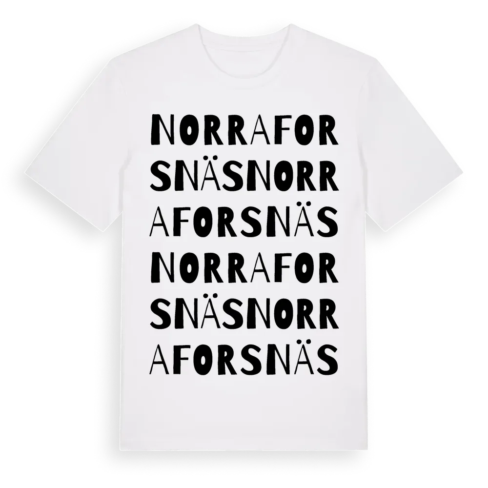 Norra Forsnäs ordlek t-shirt är inspirerad av byn Norra Forsnäs i Värmlands län, Sverige. Tröjan är designad för dig som har en speciell koppling till platsen – oavsett om du bor här, har rötterna här eller bara älskar Norra Forsnäs.