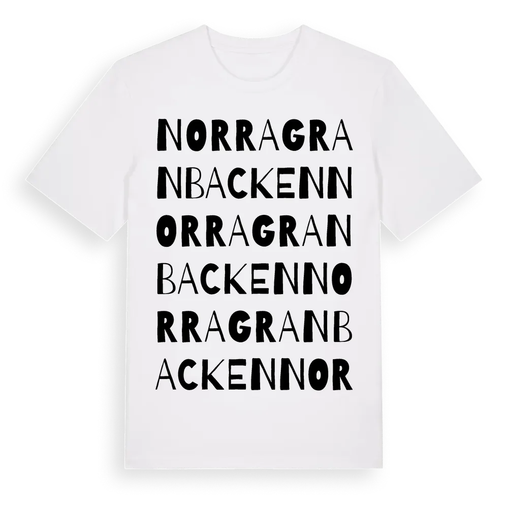 Norra Granbacken ordlek t-shirt är inspirerad av Norra Granbacken i Värmlands län, Sverige. Tröjan är designad för dig som har en speciell koppling till platsen – oavsett om du bor här, har rötterna här eller bara älskar Norra Granbacken.