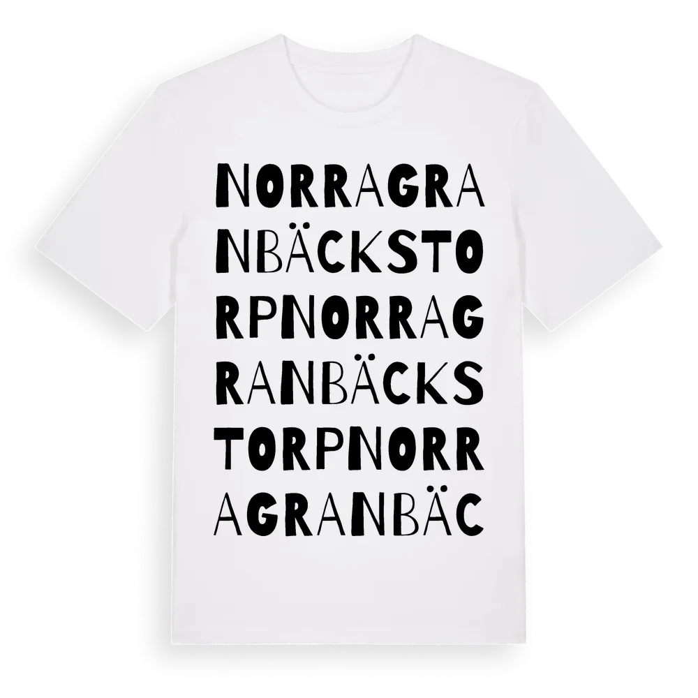 Norra Granbäckstorp ordlek t-shirt är inspirerad av Norra Granbäckstorp i Värmlands län, Sverige. Tröjan är designad för dig som har en speciell koppling till platsen – oavsett om du bor här, har rötterna här eller bara älskar Norra Granbäckstorp.