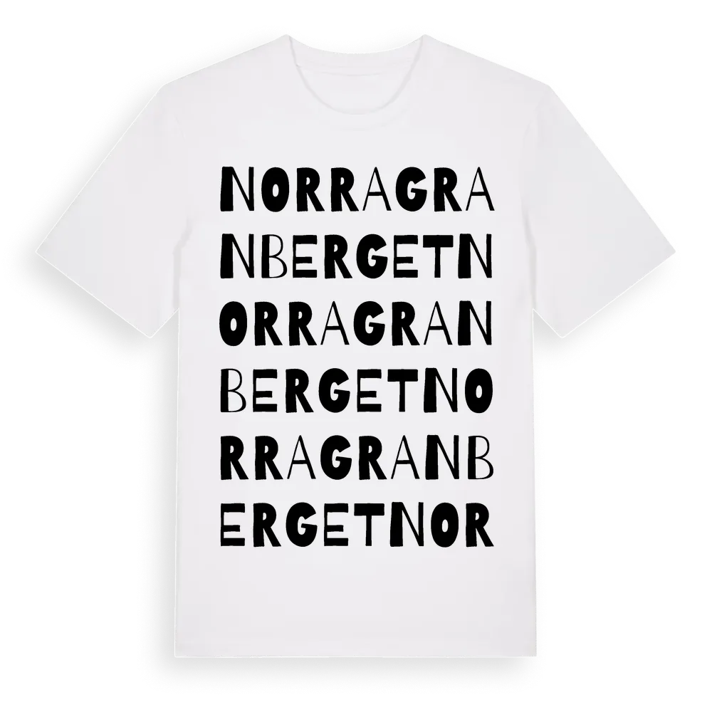 Norra Granberget ordlek t-shirt är inspirerad av Norra Granberget i Värmlands län, Sverige. Tröjan är designad för dig som har en speciell koppling till platsen – oavsett om du bor här, har rötterna här eller bara älskar Norra Granberget.