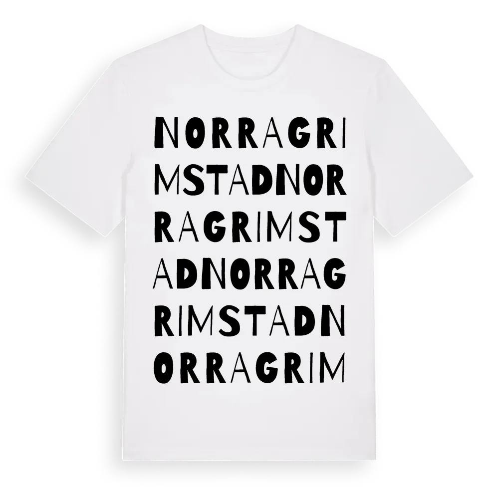 Norra Grimstad ordlek t-shirt är inspirerad av Norra Grimstad i Värmlands län, Sverige. Tröjan är designad för dig som har en speciell koppling till platsen – oavsett om du bor här, har rötterna här eller bara älskar Norra Grimstad.
