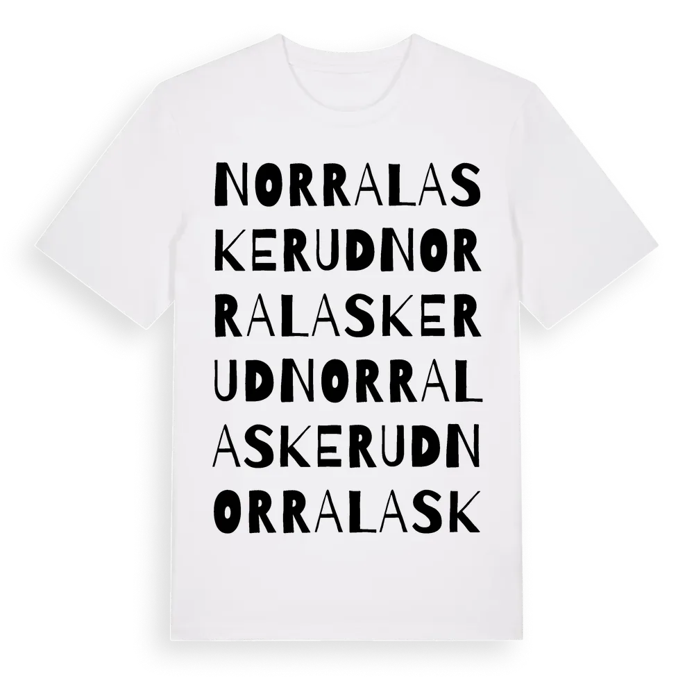 Norra Laskerud ordlek t-shirt är inspirerad av Norra Laskerud i Värmlands län, Sverige. Tröjan är designad för dig som har en speciell koppling till platsen – oavsett om du bor här, har rötterna här eller bara älskar Norra Laskerud.