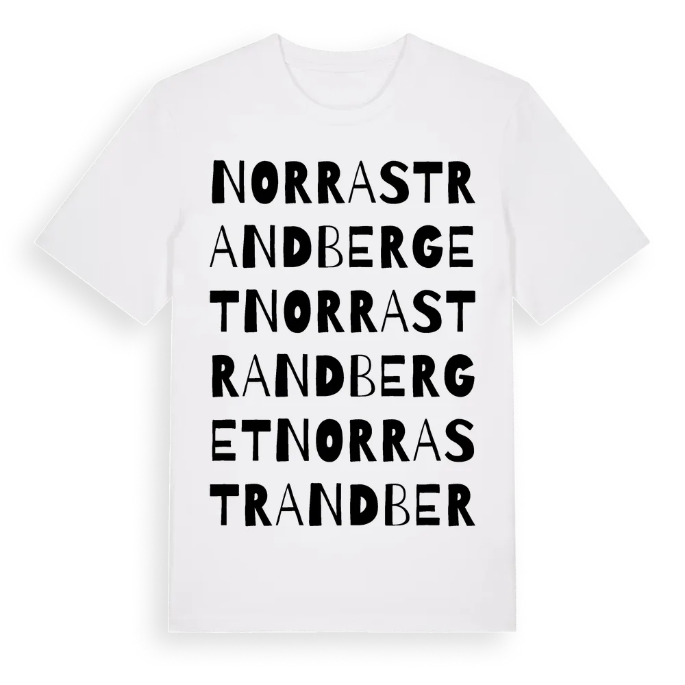 Norra Strandberget ordlek t-shirt är inspirerad av Norra Strandberget i Värmlands län, Sverige. Tröjan är designad för dig som har en speciell koppling till platsen – oavsett om du bor här, har rötterna här eller bara älskar Norra Strandberget.