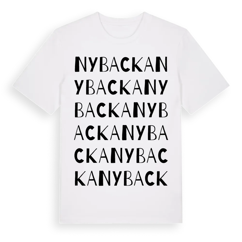 En ordlek byggd på Nybackas namn. Subtilt och klurig – ett motiv som bara de som verkligen känner platsen fullt ut förstår. Premium bomull, unisex – från byn Nybacka i Värmlands län.