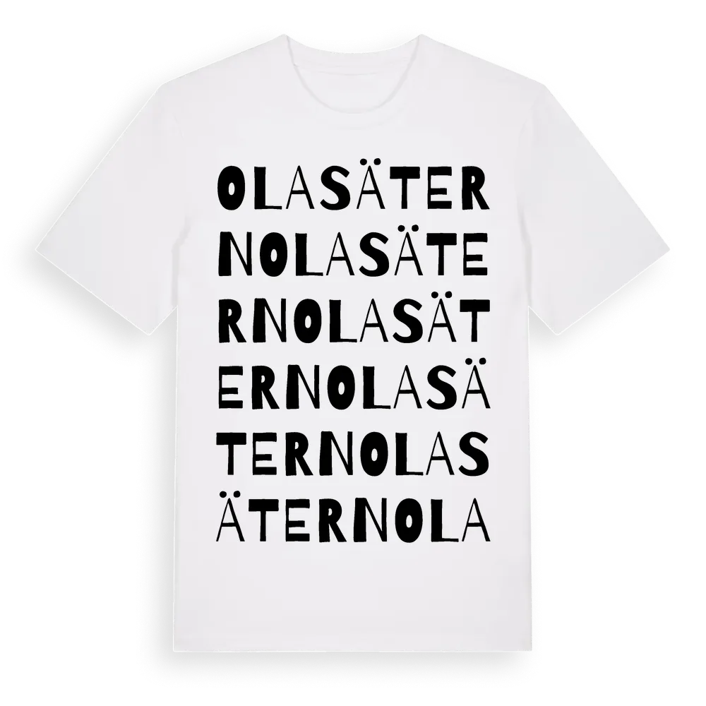 Olasätern ordlek t-shirt är inspirerad av Olasätern i Värmlands län, Sverige. Tröjan är designad för dig som har en speciell koppling till platsen – oavsett om du bor här, har rötterna här eller bara älskar Olasätern.