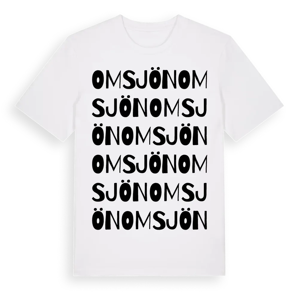 Omsjön ordlek t-shirt är inspirerad av byn Omsjön i Värmlands län, Sverige. Tröjan är designad för dig som har en speciell koppling till platsen – oavsett om du bor här, har rötterna här eller bara älskar Omsjön.