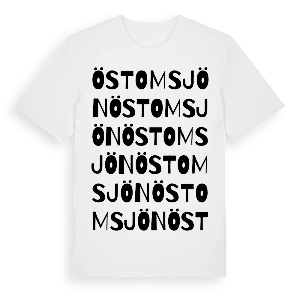 Öst Om Sjön ordlek t-shirt är inspirerad av Öst Om Sjön i Värmlands län, Sverige. Tröjan är designad för dig som har en speciell koppling till platsen – oavsett om du bor här, har rötterna här eller bara älskar Öst Om Sjön.