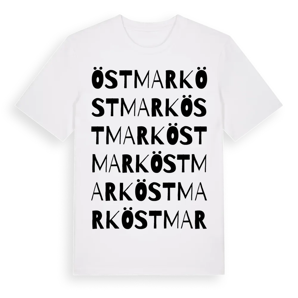 Östmark ordlek t-shirt är inspirerad av byn Östmark i Värmlands län, Sverige. Tröjan är designad för dig som har en speciell koppling till platsen – oavsett om du bor här, har rötterna här eller bara älskar Östmark.