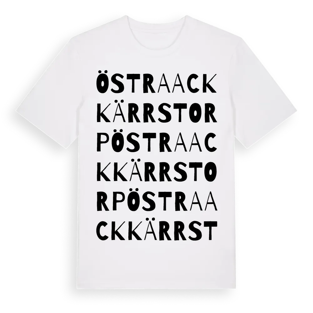 Östra Ackkärrstorp ordlek t-shirt är inspirerad av Östra Ackkärrstorp i Värmlands län, Sverige. Tröjan är designad för dig som har en speciell koppling till platsen – oavsett om du bor här, har rötterna här eller bara älskar Östra Ackkärrstorp.