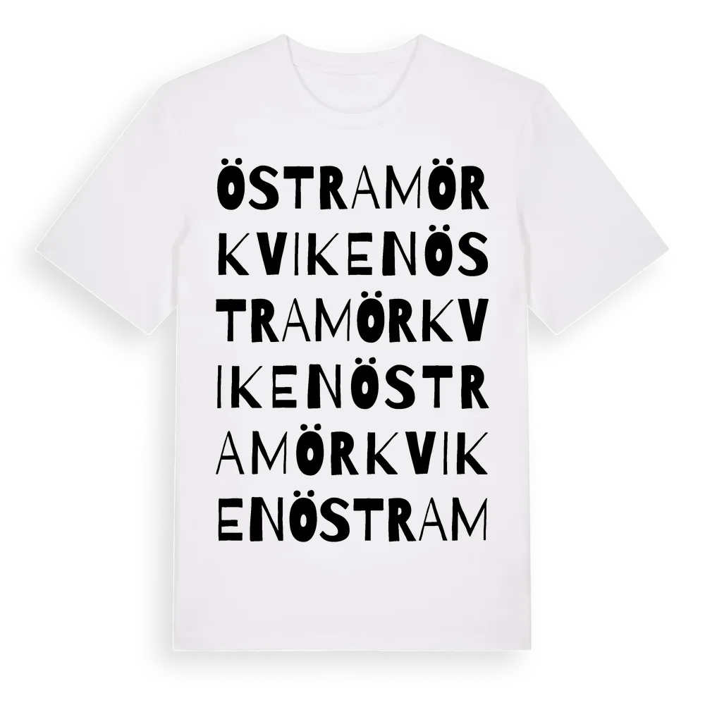 Östra Mörkviken ordlek t-shirt är inspirerad av byn Östra Mörkviken i Värmlands län, Sverige. Tröjan är designad för dig som har en speciell koppling till platsen – oavsett om du bor här, har rötterna här eller bara älskar Östra Mörkviken.