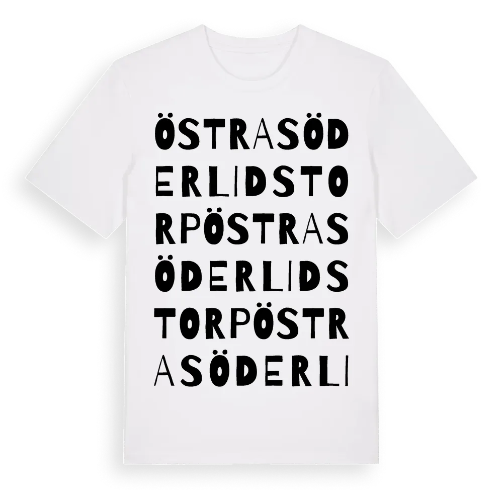 Östra Söderlidstorp ordlek t-shirt är inspirerad av Östra Söderlidstorp i Värmlands län, Sverige. Tröjan är designad för dig som har en speciell koppling till platsen – oavsett om du bor här, har rötterna här eller bara älskar Östra Söderlidstorp.