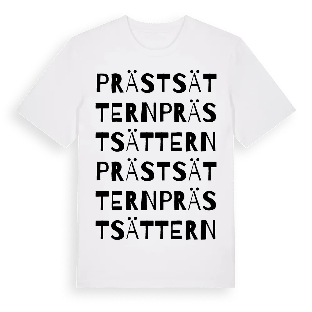 Prästsättern ordlek t-shirt är inspirerad av Prästsättern i Värmlands län, Sverige. Tröjan är designad för dig som har en speciell koppling till platsen – oavsett om du bor här, har rötterna här eller bara älskar Prästsättern.