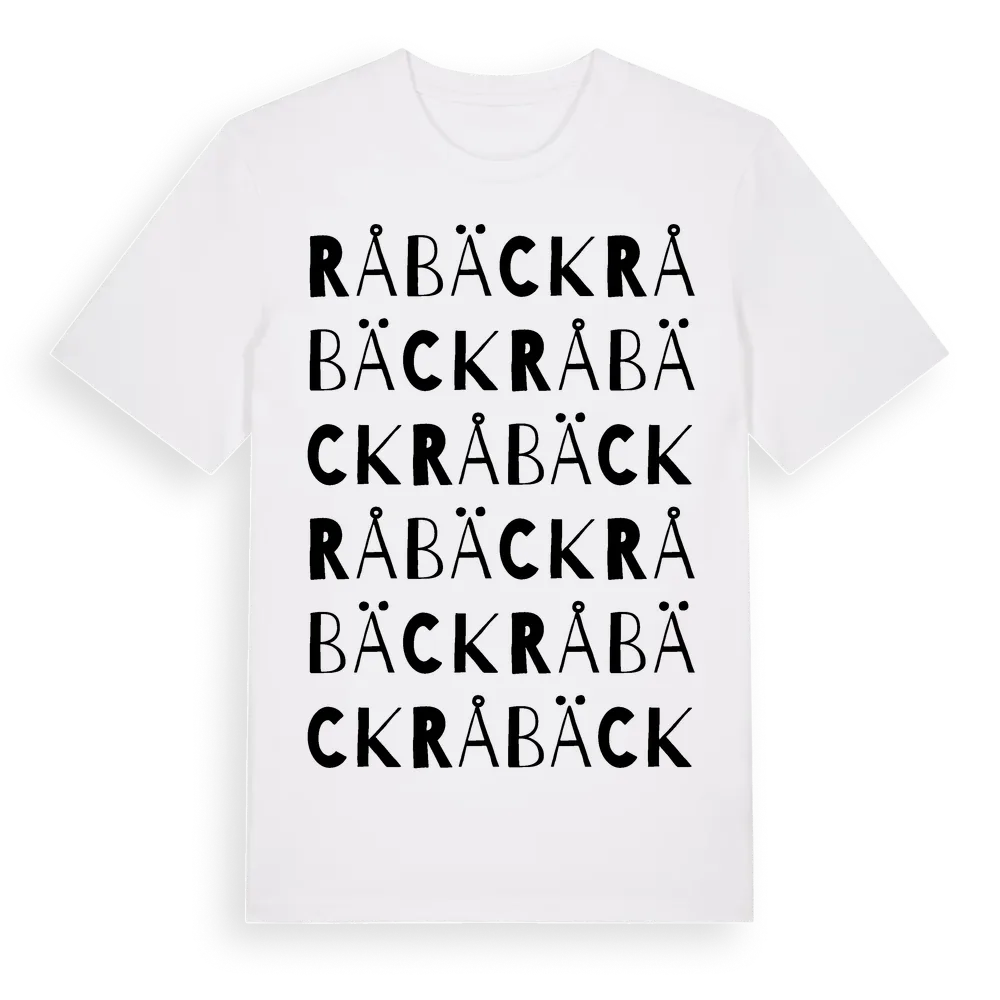 Råbäck ordlek t-shirt är inspirerad av Råbäck i Värmlands län, Sverige. Tröjan är designad för dig som har en speciell koppling till platsen – oavsett om du bor här, har rötterna här eller bara älskar Råbäck.