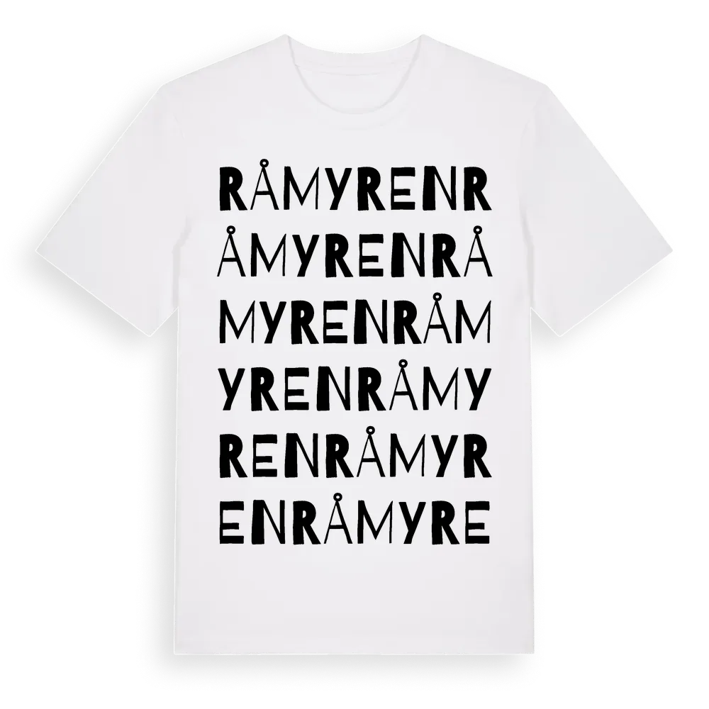 Råmyren ordlek t-shirt är inspirerad av Råmyren i Värmlands län, Sverige. Tröjan är designad för dig som har en speciell koppling till platsen – oavsett om du bor här, har rötterna här eller bara älskar Råmyren.