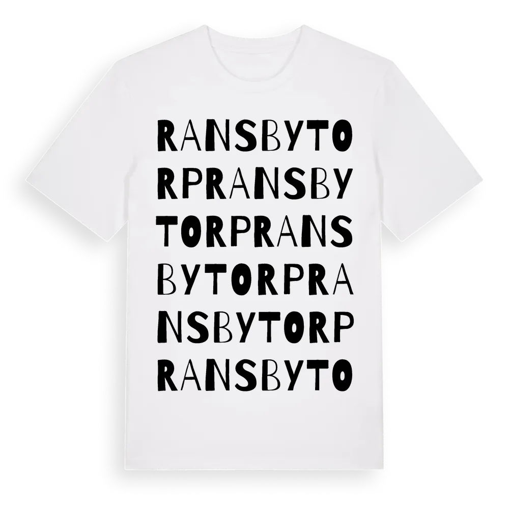 Ransbytorp ordlek t-shirt är inspirerad av Ransbytorp i Värmlands län, Sverige. Tröjan är designad för dig som har en speciell koppling till platsen – oavsett om du bor här, har rötterna här eller bara älskar Ransbytorp.