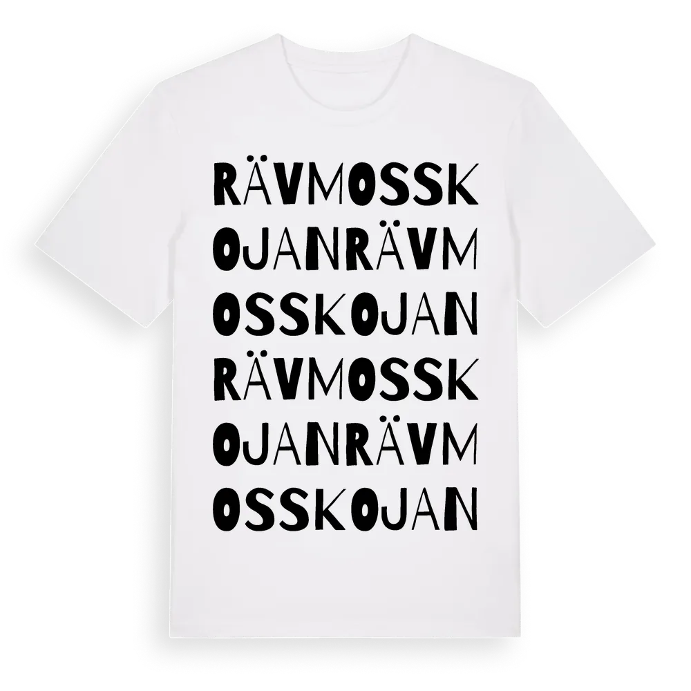 Rävmosskojan ordlek t-shirt är inspirerad av Rävmosskojan i Värmlands län, Sverige. Tröjan är designad för dig som har en speciell koppling till platsen – oavsett om du bor här, har rötterna här eller bara älskar Rävmosskojan.