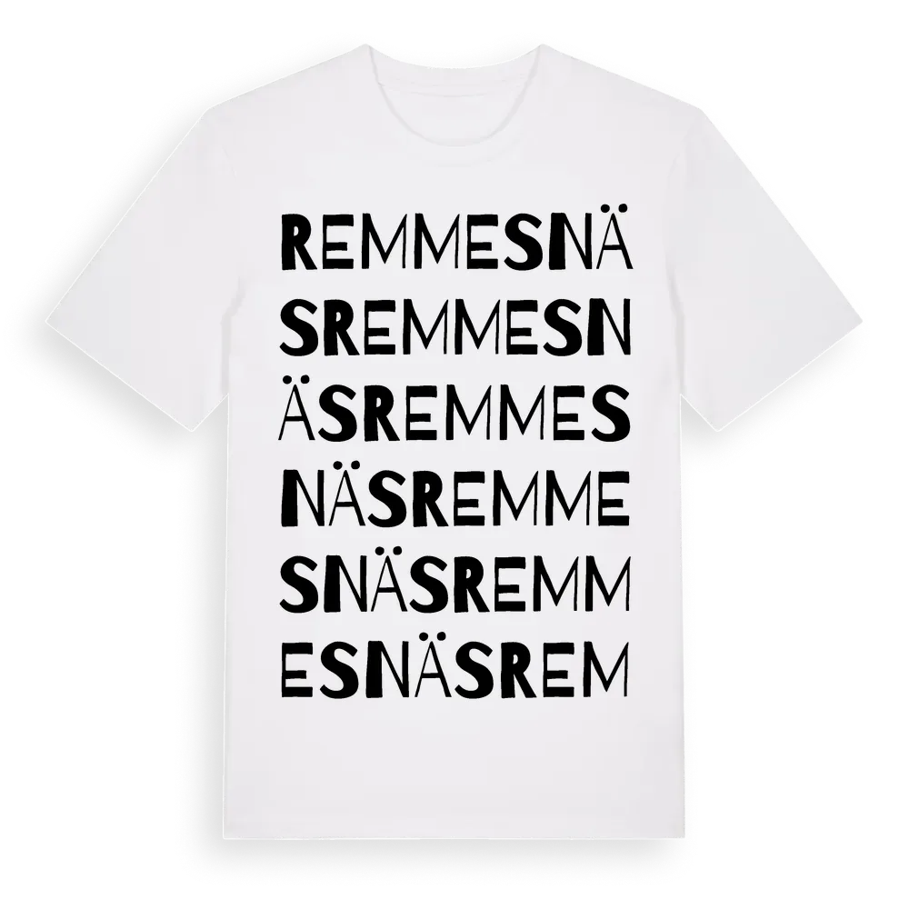 Remmesnäs ordlek t-shirt är inspirerad av byn Remmesnäs i Värmlands län, Sverige. Tröjan är designad för dig som har en speciell koppling till platsen – oavsett om du bor här, har rötterna här eller bara älskar Remmesnäs.