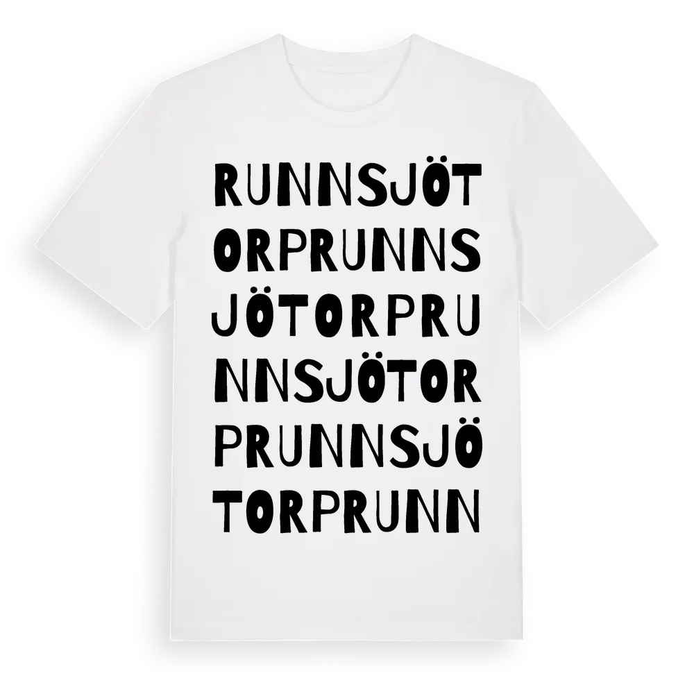 Runnsjötorp ordlek t-shirt är inspirerad av byn Runnsjötorp i Värmlands län, Sverige. Tröjan är designad för dig som har en speciell koppling till platsen – oavsett om du bor här, har rötterna här eller bara älskar Runnsjötorp.