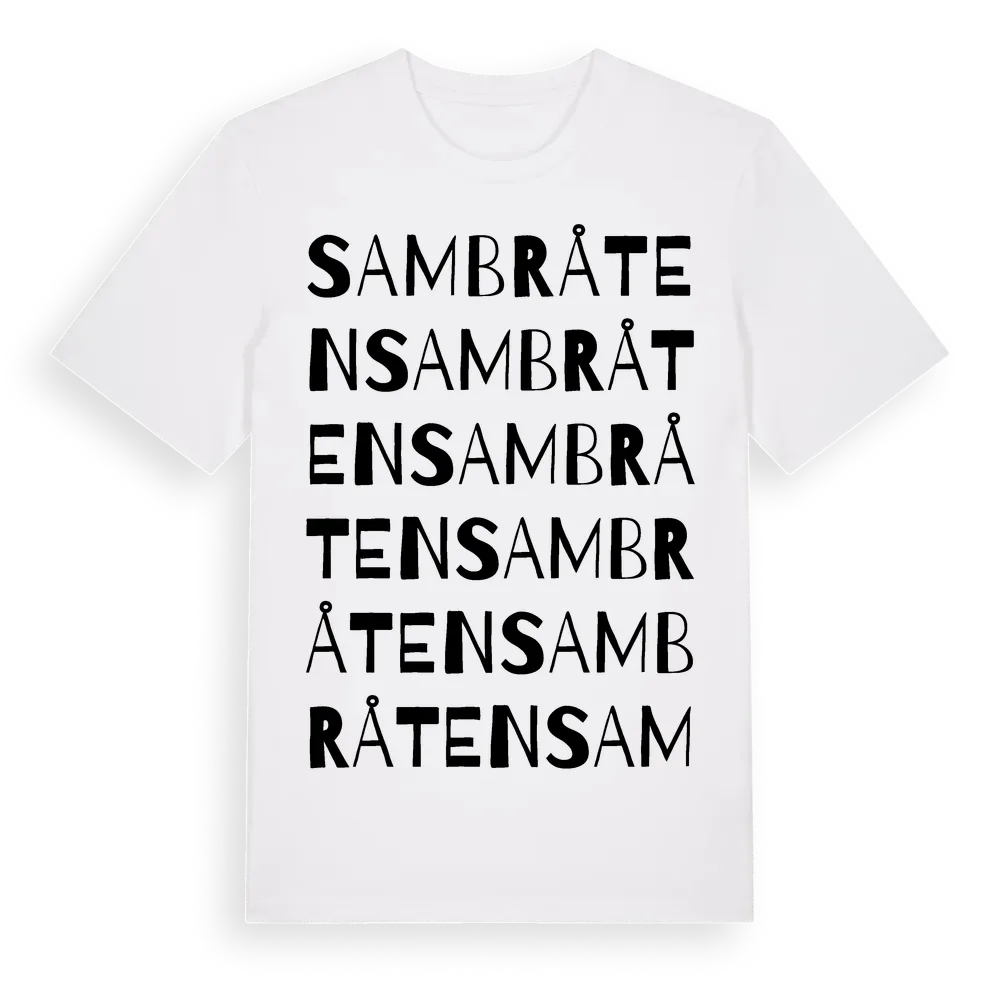 Sambråten ordlek t-shirt är inspirerad av Sambråten i Värmlands län, Sverige. Tröjan är designad för dig som har en speciell koppling till platsen – oavsett om du bor här, har rötterna här eller bara älskar Sambråten.