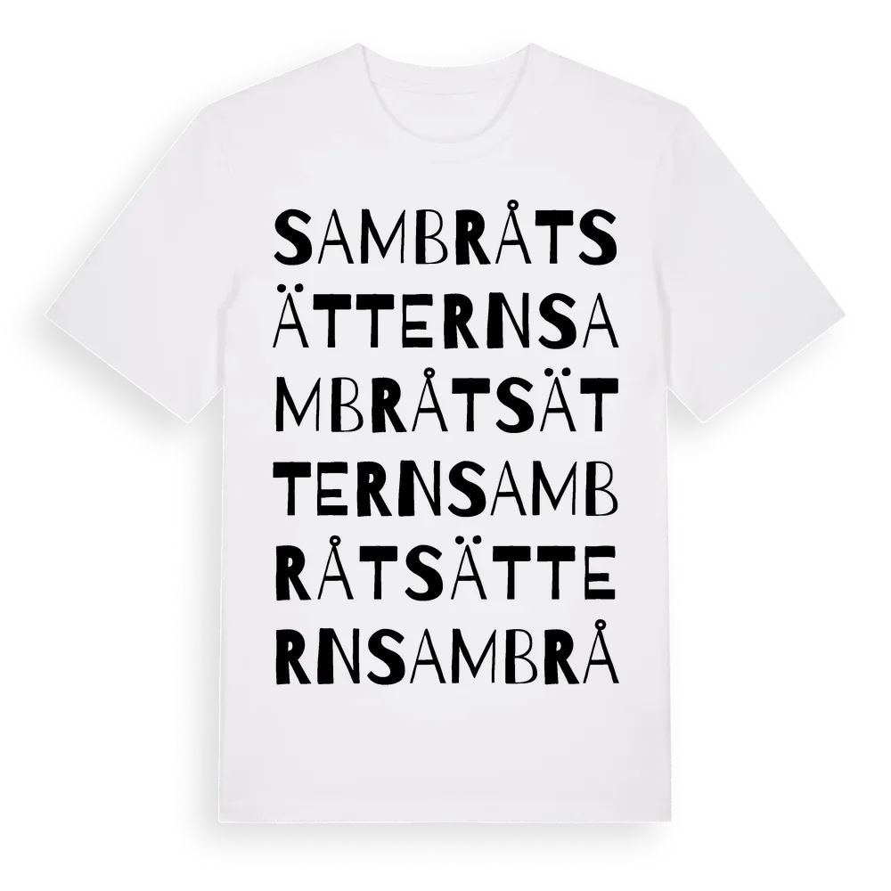 Sambråtsättern ordlek t-shirt är inspirerad av Sambråtsättern i Värmlands län, Sverige. Tröjan är designad för dig som har en speciell koppling till platsen – oavsett om du bor här, har rötterna här eller bara älskar Sambråtsättern.