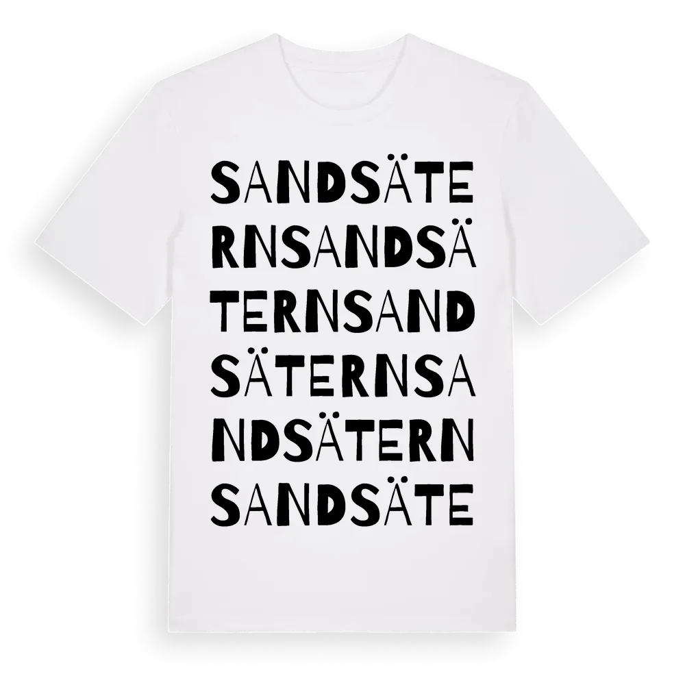 Sandsätern ordlek t-shirt är inspirerad av byn Sandsätern i Värmlands län, Sverige. Tröjan är designad för dig som har en speciell koppling till platsen – oavsett om du bor här, har rötterna här eller bara älskar Sandsätern.