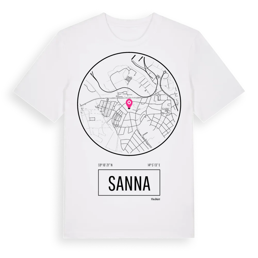 Ett rent, runt tryck med Sannas namn. Minimalistiskt och stilrent – perfekt för den som känner platsen utan att skrika det. Premium bomull, unisex – från stadsdelen Sanna i Värmlands län.