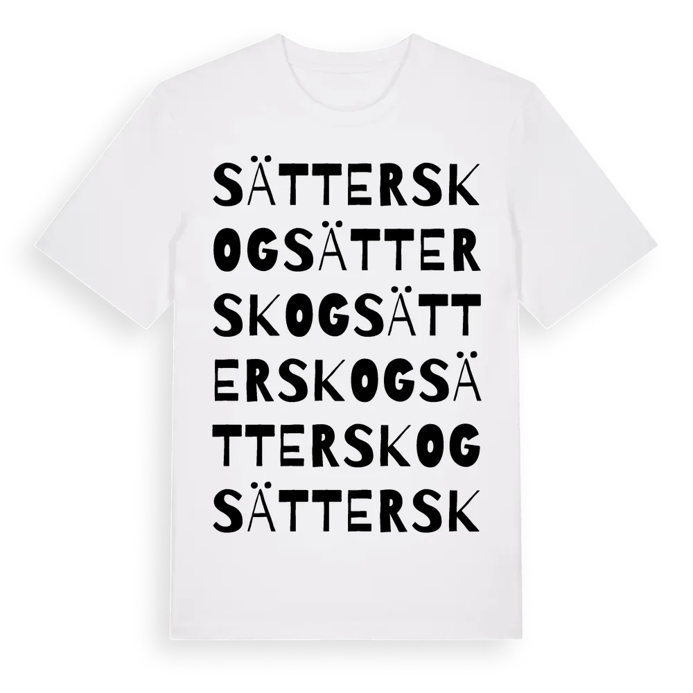 Sätterskog ordlek t-shirt är inspirerad av byn Sätterskog i Värmlands län, Sverige. Tröjan är designad för dig som har en speciell koppling till platsen – oavsett om du bor här, har rötterna här eller bara älskar Sätterskog.