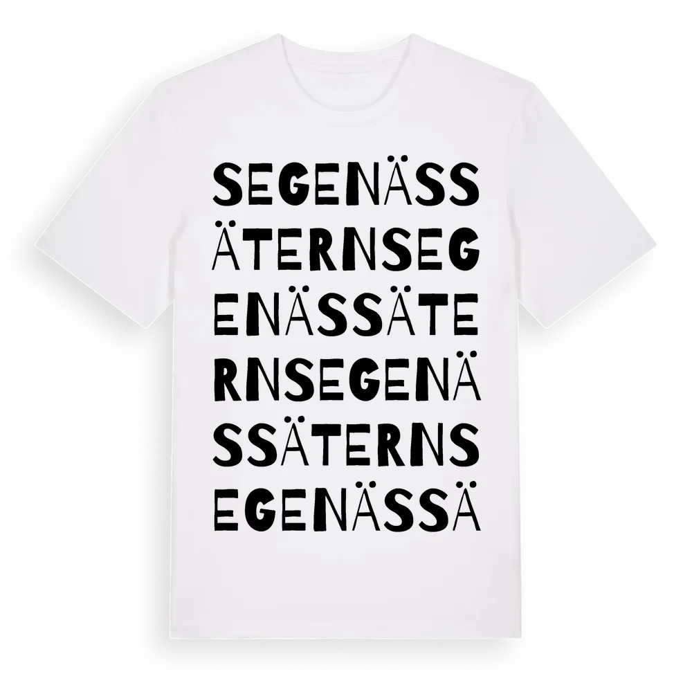 Segenässätern ordlek t-shirt är inspirerad av byn Segenässätern i Värmlands län, Sverige. Tröjan är designad för dig som har en speciell koppling till platsen – oavsett om du bor här, har rötterna här eller bara älskar Segenässätern.