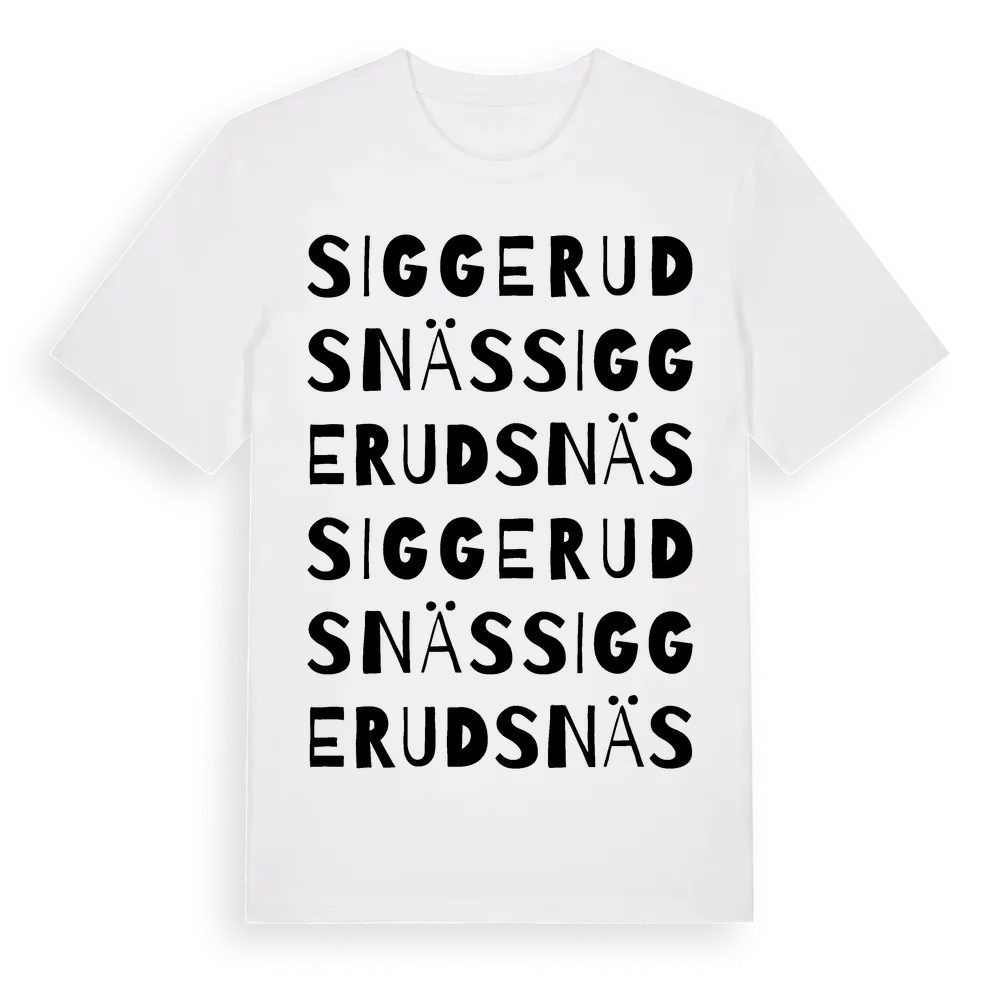 Siggerudsnäs ordlek t-shirt är inspirerad av byn Siggerudsnäs i Värmlands län, Sverige. Tröjan är designad för dig som har en speciell koppling till platsen – oavsett om du bor här, har rötterna här eller bara älskar Siggerudsnäs.