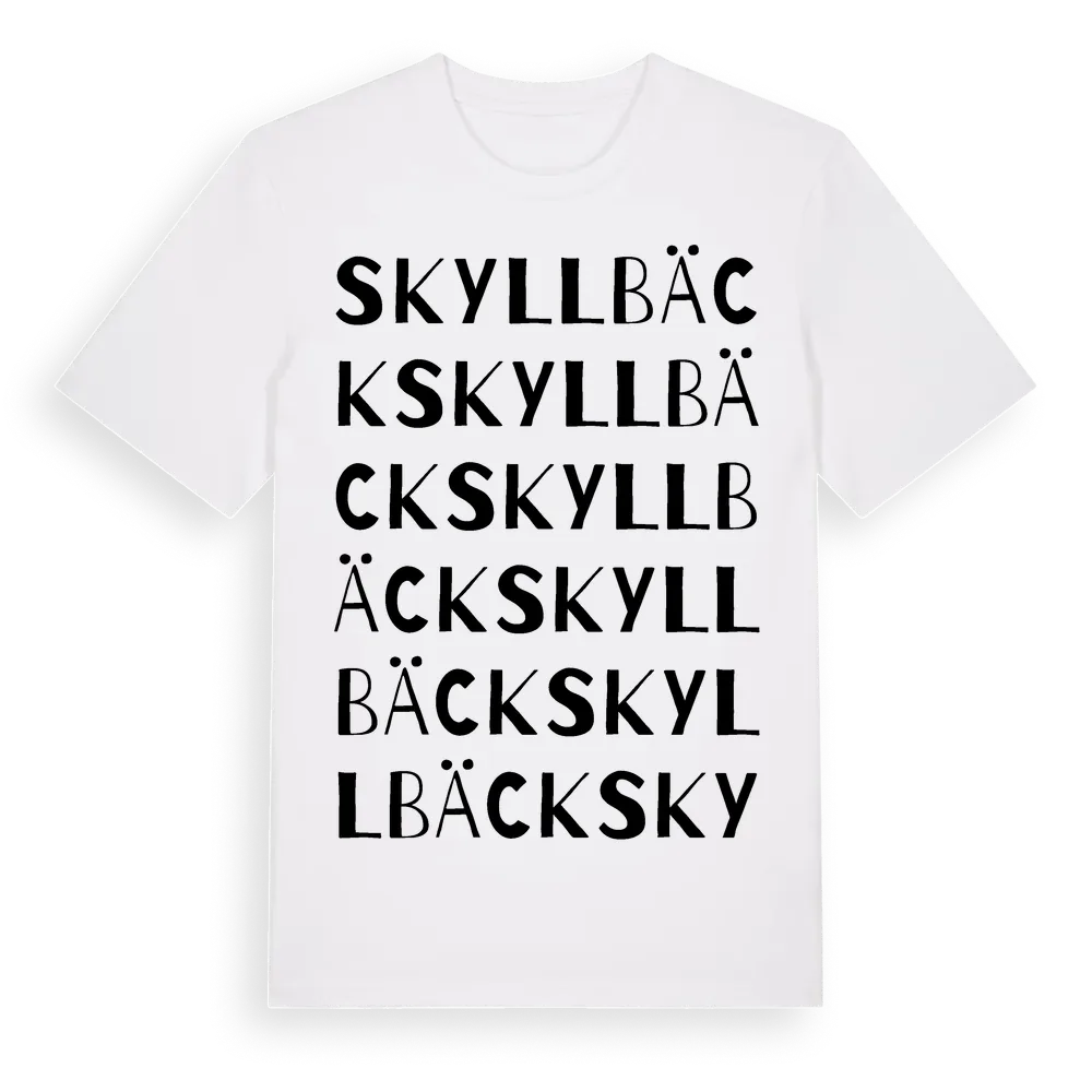 Skyllbäck ordlek t-shirt är inspirerad av Skyllbäck i Värmlands län, Sverige. Tröjan är designad för dig som har en speciell koppling till platsen – oavsett om du bor här, har rötterna här eller bara älskar Skyllbäck.