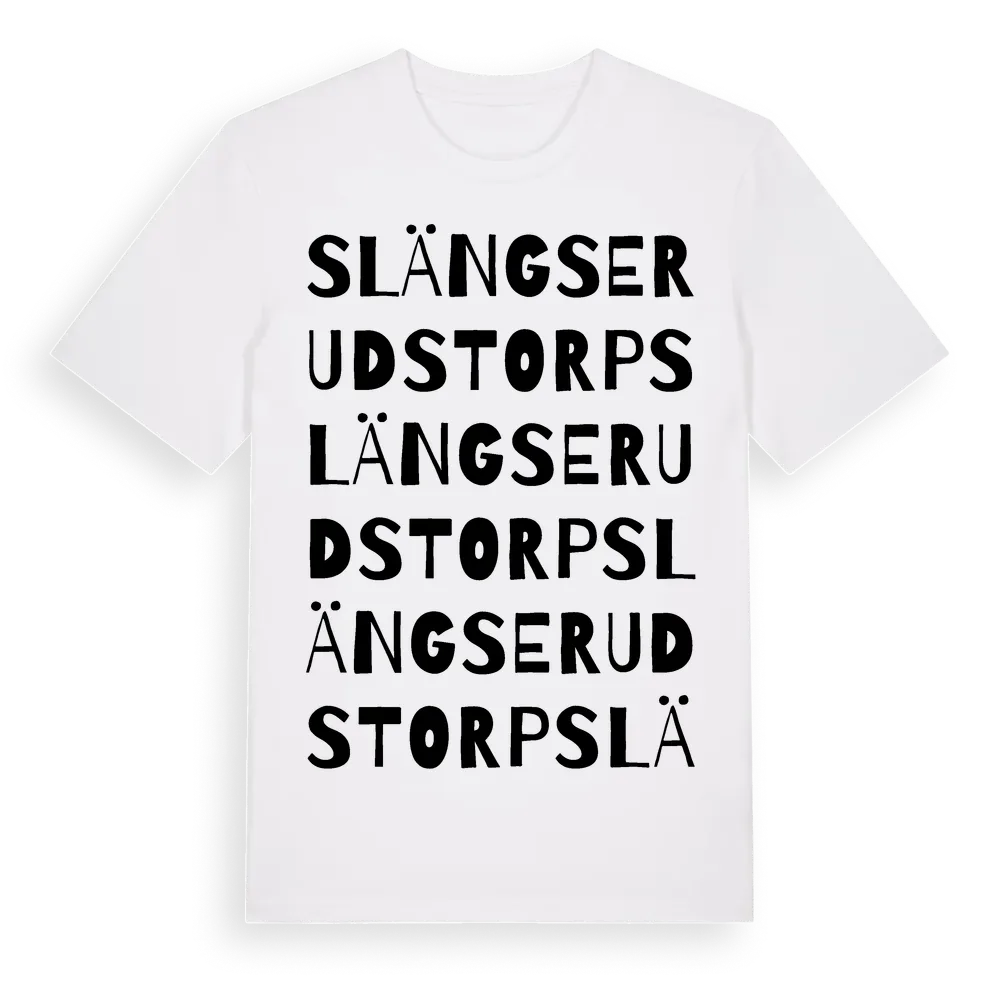 Slängserudstorp ordlek t-shirt är inspirerad av byn Slängserudstorp i Värmlands län, Sverige. Tröjan är designad för dig som har en speciell koppling till platsen – oavsett om du bor här, har rötterna här eller bara älskar Slängserudstorp.