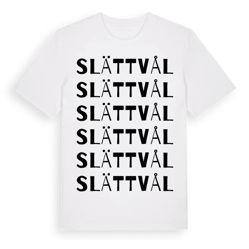 Slättvål ordlek t-shirt är inspirerad av byn Slättvål i Värmlands län, Sverige. Tröjan är designad för dig som har en speciell koppling till platsen – oavsett om du bor här, har rötterna här eller bara älskar Slättvål.