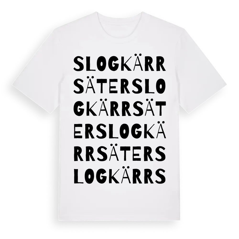 Slogkärrsäter ordlek t-shirt är inspirerad av Slogkärrsäter i Värmlands län, Sverige. Tröjan är designad för dig som har en speciell koppling till platsen – oavsett om du bor här, har rötterna här eller bara älskar Slogkärrsäter.