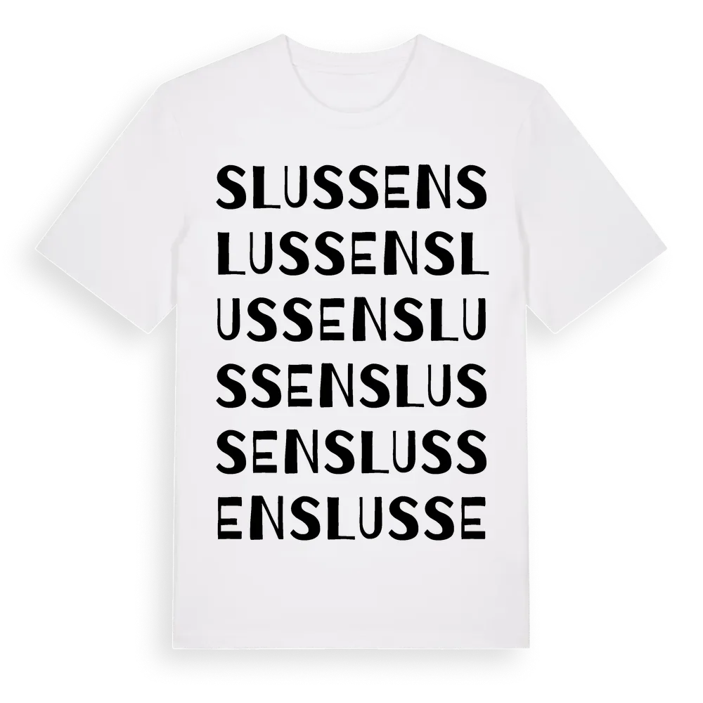 En ordlek byggd på Slussens namn. Subtilt och klurig – ett motiv som bara de som verkligen känner platsen fullt ut förstår. Premium bomull, unisex – från Slussen i Värmlands län.