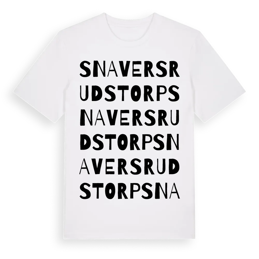 Snaversrudstorp ordlek t-shirt är inspirerad av Snaversrudstorp i Värmlands län, Sverige. Tröjan är designad för dig som har en speciell koppling till platsen – oavsett om du bor här, har rötterna här eller bara älskar Snaversrudstorp.