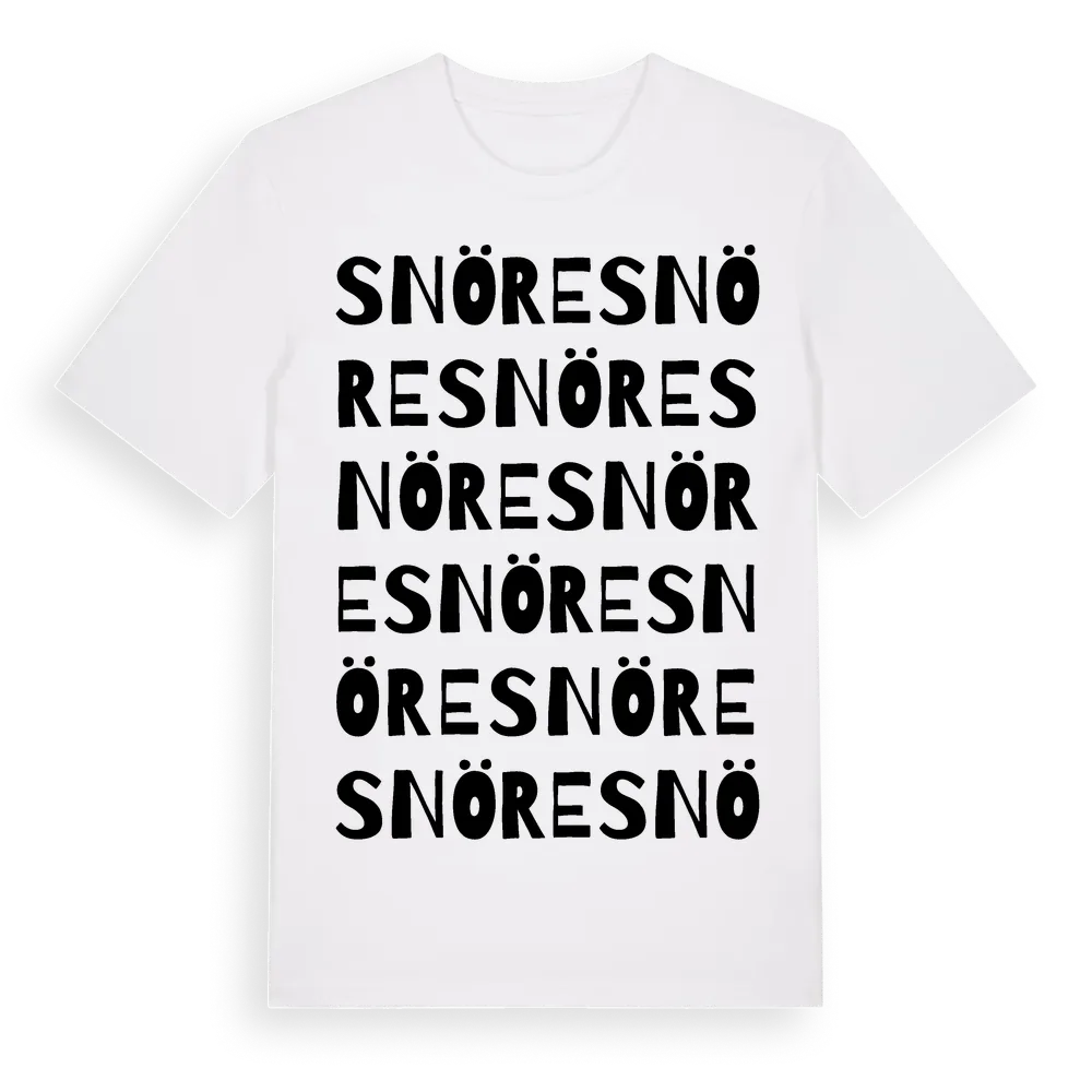 En ordlek byggd på Snöres namn. Subtilt och klurig – ett motiv som bara de som verkligen känner platsen fullt ut förstår. Premium bomull, unisex – från byn Snöre i Värmlands län.