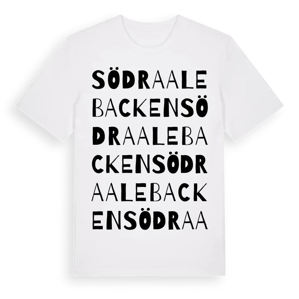 Södra Alebacken ordlek t-shirt är inspirerad av Södra Alebacken i Värmlands län, Sverige. Tröjan är designad för dig som har en speciell koppling till platsen – oavsett om du bor här, har rötterna här eller bara älskar Södra Alebacken.