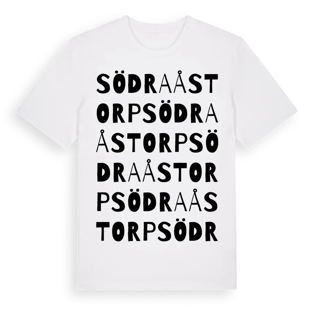 Södra Åstorp ordlek t-shirt är inspirerad av Södra Åstorp i Värmlands län, Sverige. Tröjan är designad för dig som har en speciell koppling till platsen – oavsett om du bor här, har rötterna här eller bara älskar Södra Åstorp.